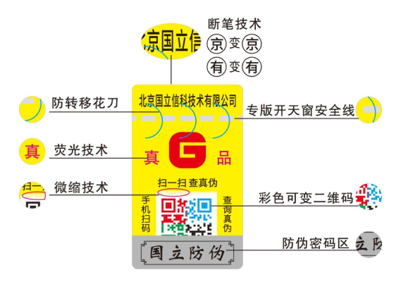 属于一线防伪,大众肉眼即可识别。在普通面光源下即可鉴别,具有金属光泽效果,使整个标签具有品质感,防伪力度强。