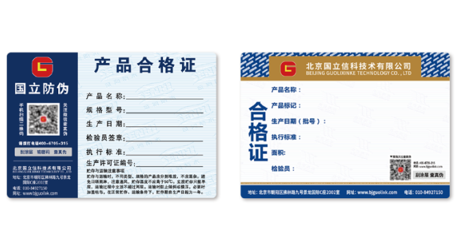 防伪合格证是由防伪标签和合格证合为一体的一种防伪标识物,其兼有防伪标签和合格证两者特性,是企业为节约成本及减少其它各项投入的基础上制作的一种集两都功能于一体的标识物。