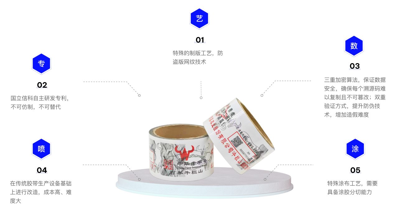 防伪技术创新:将标签部分防伪技术(防盗版底纹、断笔技术、智码技术)应用至包装胶带;