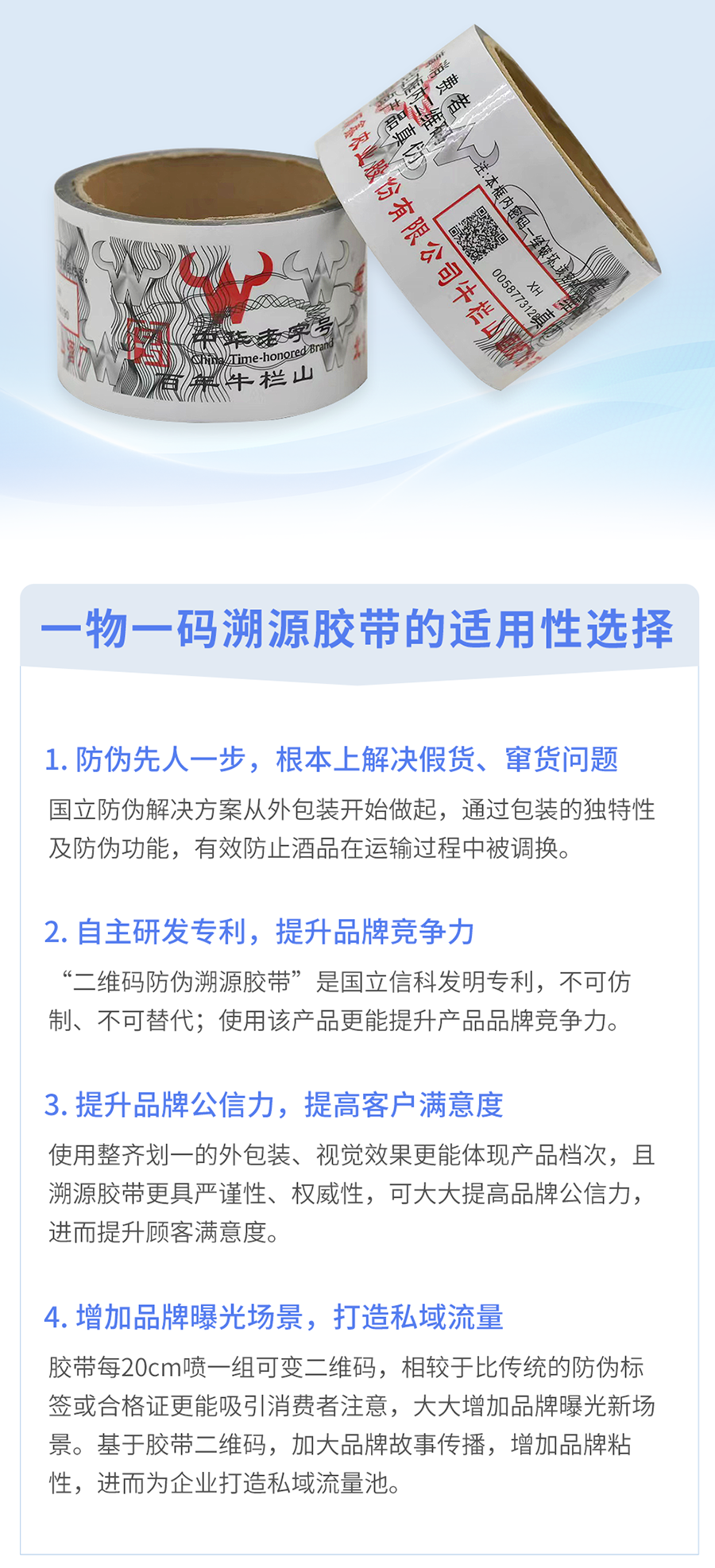 运用内外多种赋码技术完成“一瓶一码、一箱一码”升级,利用数字防伪胶带全面提升包装科技含量及品牌公信力,多级防伪码关联,大大降低了窜货可能,根本上抑制假货蔓延。同时胶带的使用,还增加了曝光场景,大大提高了扫码验证概率。