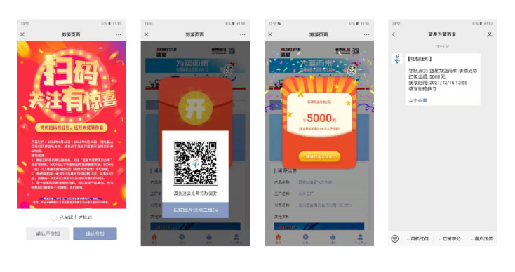 在瓶盖上赋码也属于一物一码的应用方式之一,消费者扫盖码后,开奖成功,可自动跳转到蓝星小程序,以红包激励更多人购买扫码,并在小程序完成复购。